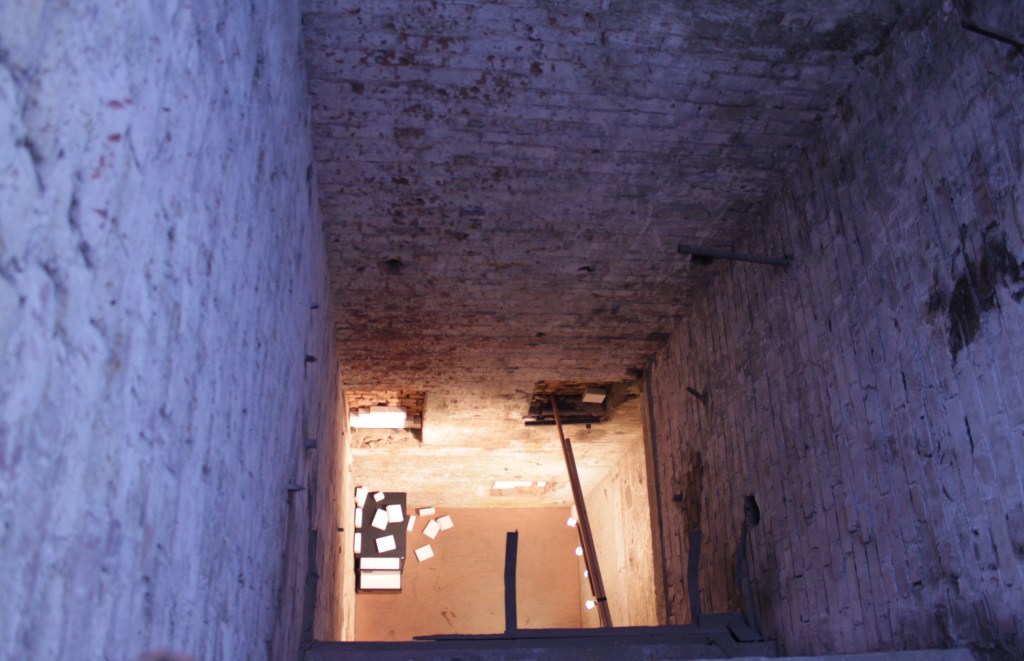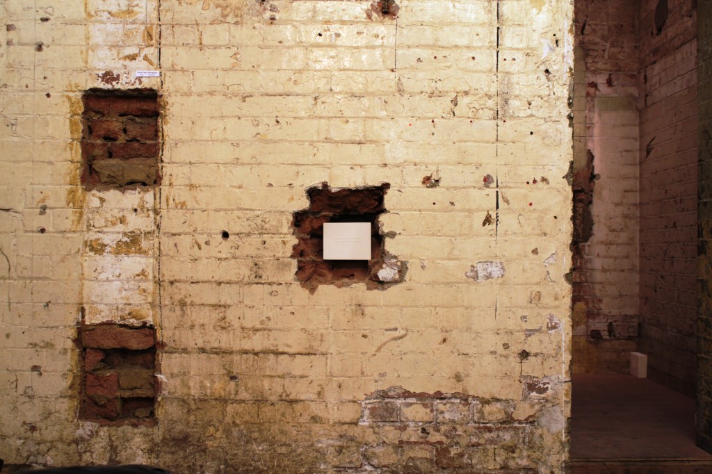 Bricks installed in the disused lift shaft at Testbed referring to the images / clues / the writing on the wall found in the strange and unknown place that is described in the text of Brewster’s House: